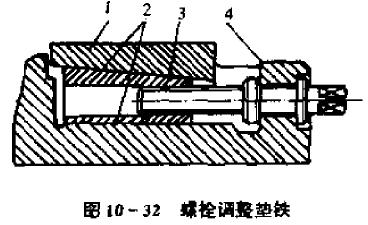 5)螺栓調整墊鐵:其構造很簡單,是應用兩個斜滑板相對移動、改變總高度的原理做成的(圖10-32)。采用這種墊鐵,只需擰動調整螺釘,即可靈敏調節機床的高度,既方便、準確,又提高效率。